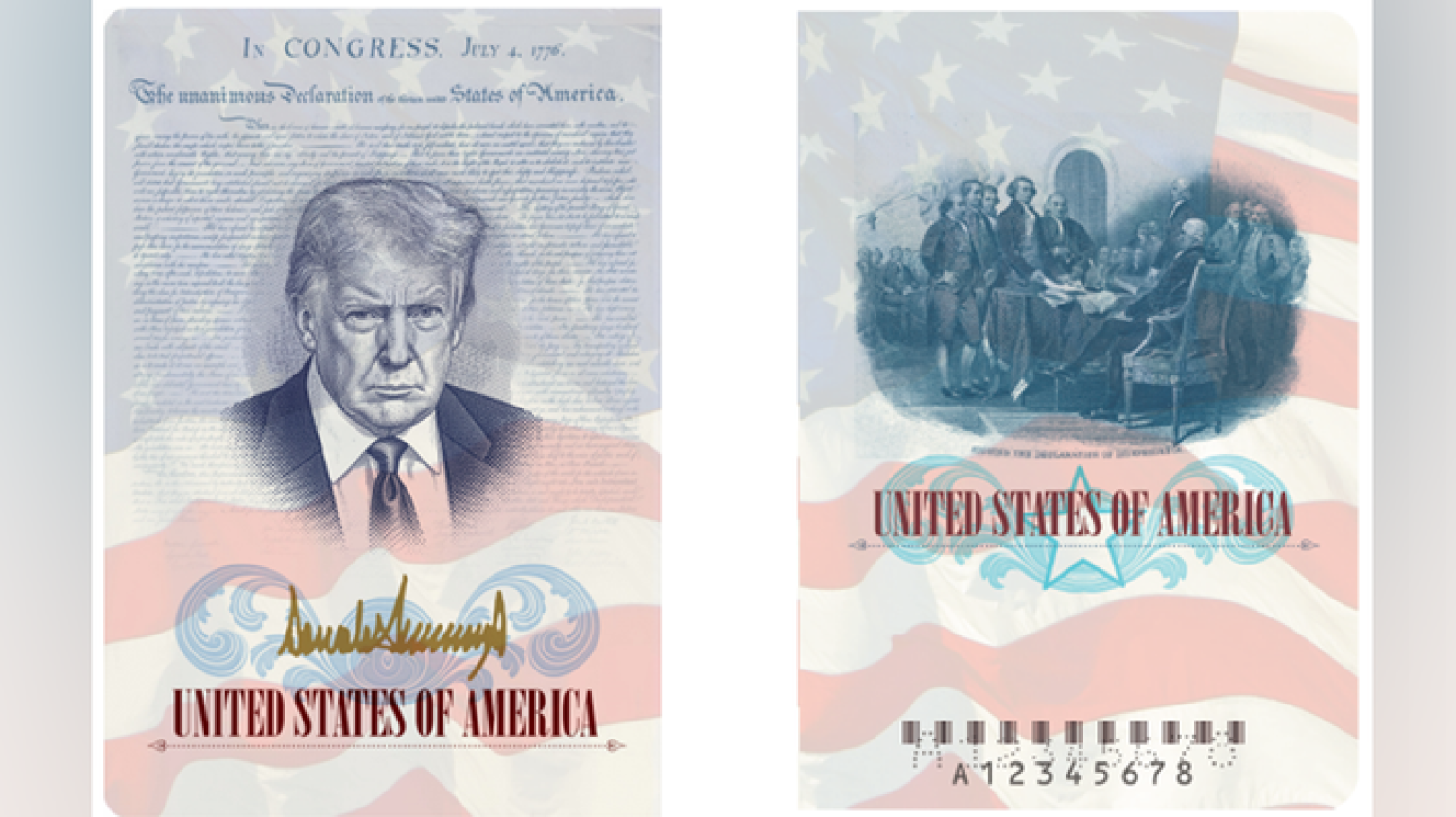 Անձնագրի մակետի վրա, որի օրինակը հայտնվել է հեռուստաալիքի տրամադրության տակ, փաստաթղթի ներքին կողմում Թրամփի դիմանկարը շրջապատված է Անկախության հռչակագրի տեքստով և ԱՄՆ դրոշով։ Մյուս էջում պատկերված է ամերիկացի նկարիչ Ջոն Թրամբուլի «Անկախության հռչակագիրը» կտավը, որը պատկերում է Ամերիկայի հիմնադիր հայրերին։