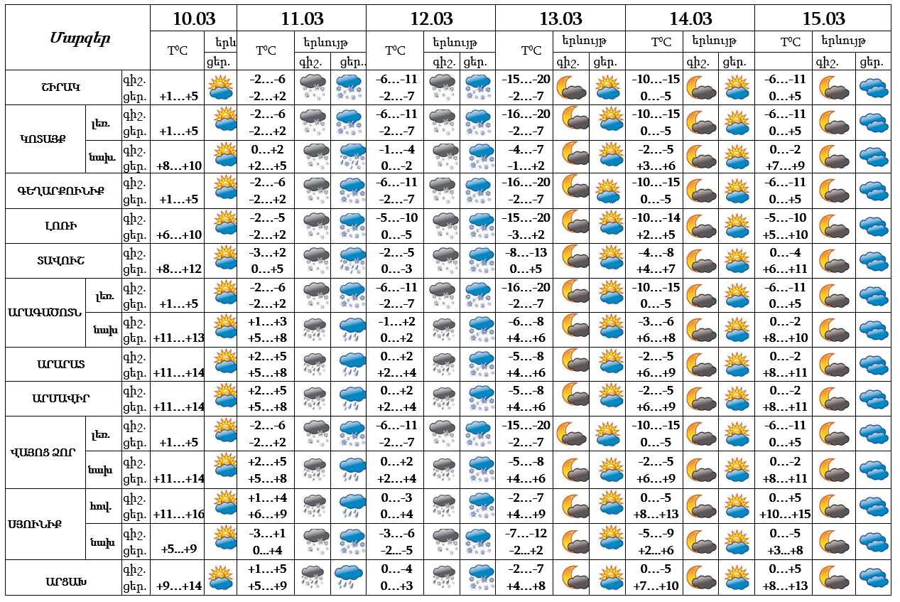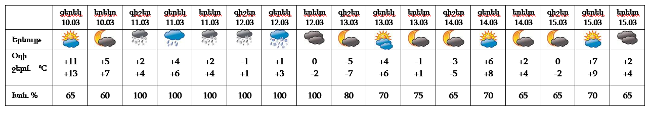 Մարտի 13-15-ին սպասվում է առանց տեղումների եղանակ: Մարտի 11-12-ին ժամանակ առ ժամանակ սպասվում են տեղումներ, 11-ին ձնախառն անձրևի, 12-ին ձյան տեսքով: